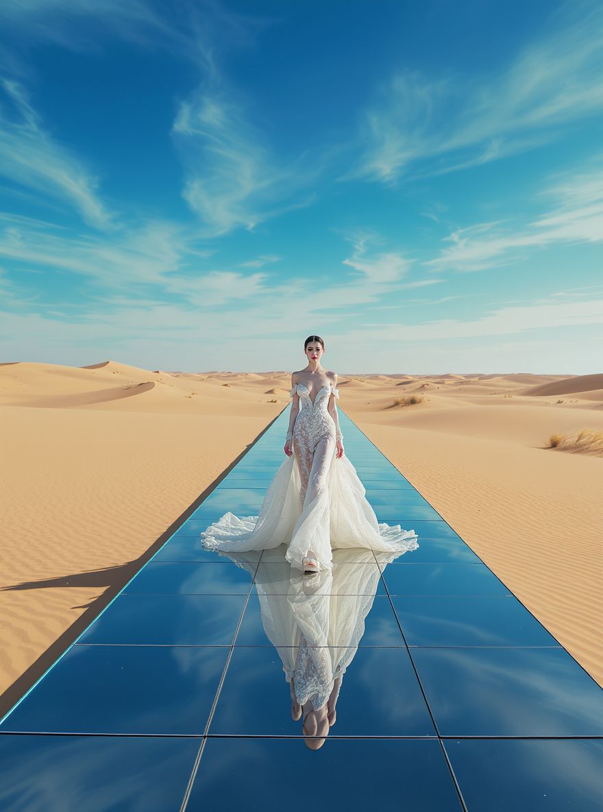 A model in a haute couture gown walks on a mirrored runway in a vast sand desert. Deep blue sky, wide shot, surreal and luxurious style, natural lighting.