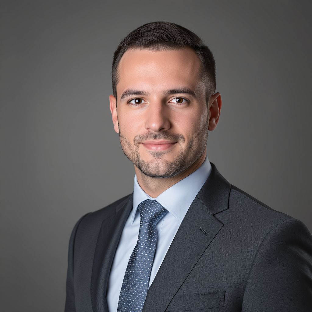 Crée un portrait professionnel photoréaliste d'un consultant en stratégie digitale de 35 ans, inspirant confiance et expertise. Plan américain, éclairage studio doux, fond gris, 4K, format carré.