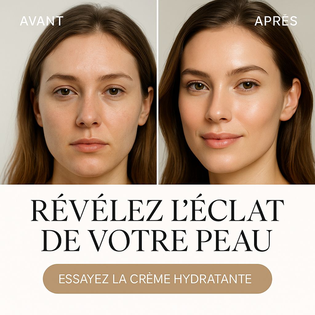 Crée une image publicitaire 1080x1080 pour une crème hydratante, illustrant un avant-après avec une peau terne devenant radieuse. Adopte un style élégant, lumineux et naturel, avec un slogan inspirant et un appel à l’action clair. Le texte dans l’image doit être en français.