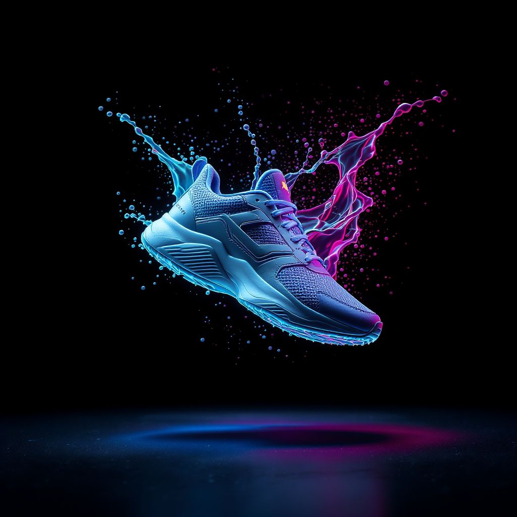 Crée une image publicitaire d'une basket futuriste en lévitation, tournant lentement au centre d'un espace sombre. Éclaboussures de liquide cyan et magenta figées autour. Style minimaliste, high-tech, éclairage studio net, format carré.